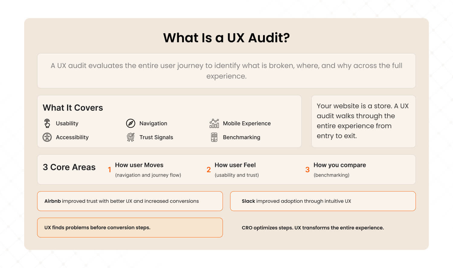 Key Takeaway: A UX audit finds problems CRO would never look for, because they happen before users reach the conversion step. Airbnb's trust problem and Slack's adoption advantage were UX wins, not CRO wins.