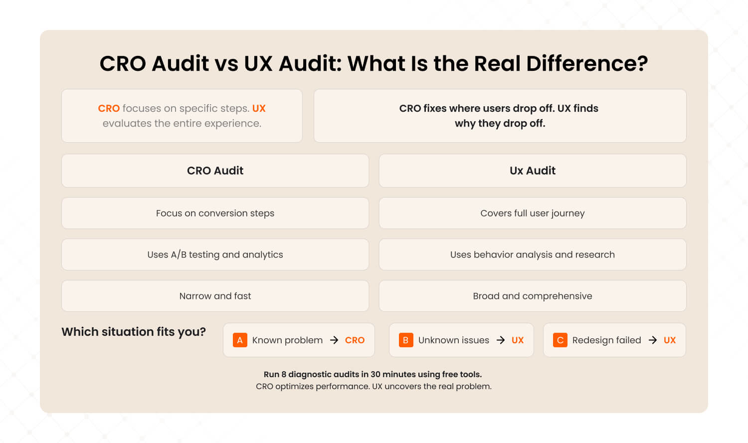 A CRO audit optimizes your conversion funnel. A UX audit evaluates your entire user experience. Most businesses need the second one.