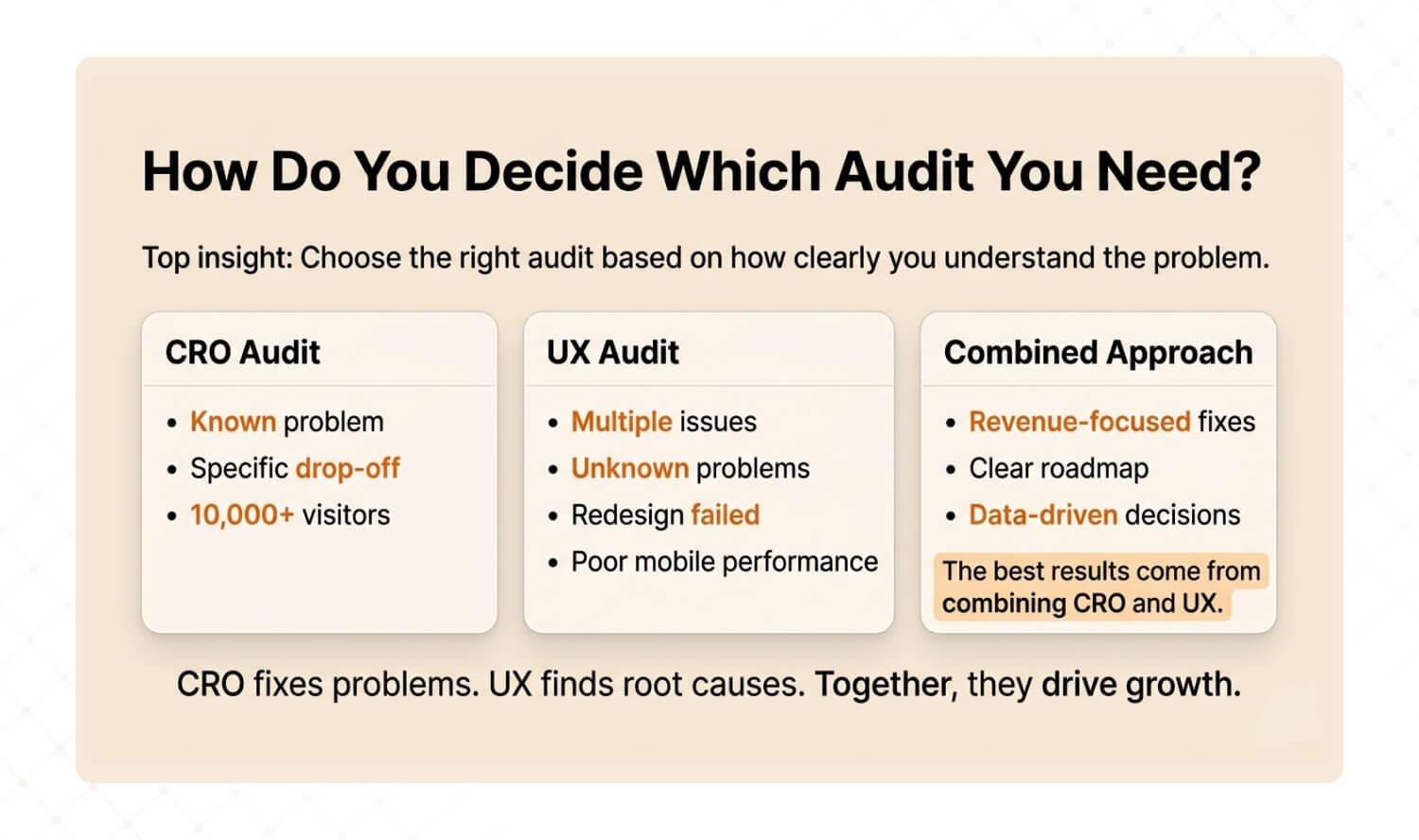 If you know exactly which page or funnel step is broken, a CRO audit may be enough. If you have multiple symptoms, are unsure where the problem is, or recently redesigned without results, start with a UX audit. The best results come from a combined approach that ties every UX fix to a revenue number.