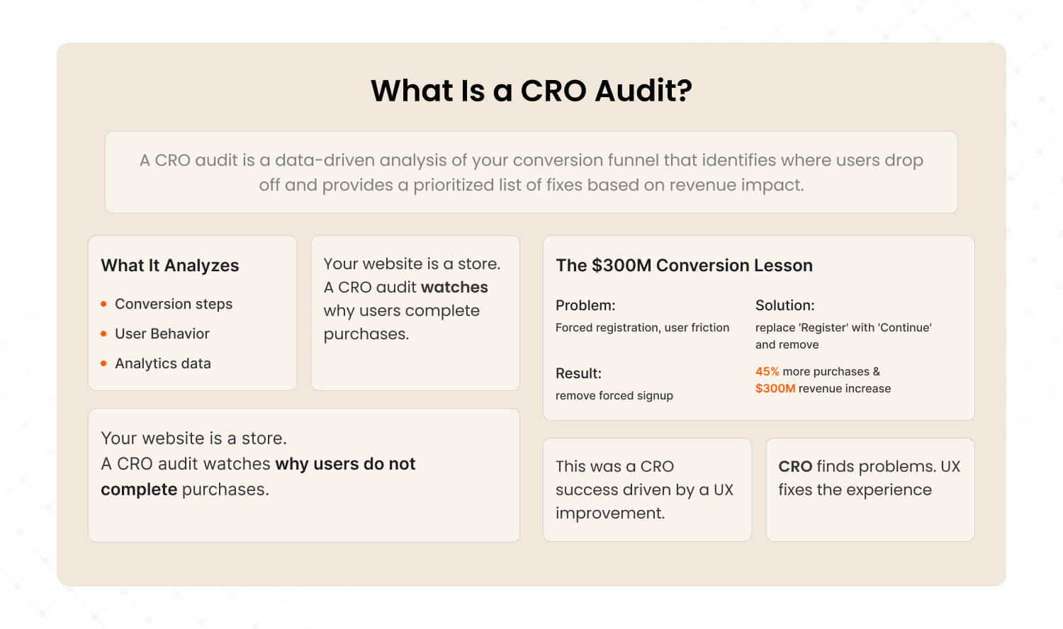 Simple analogy: if your website is a store, a CRO audit stands at the checkout counter and watches why people put items back on the shelf instead of paying.