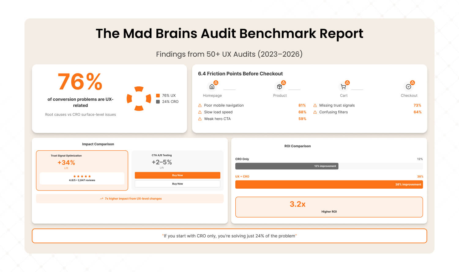 76% of conversion issues - traced to UX root causes, not isolated CRO elements