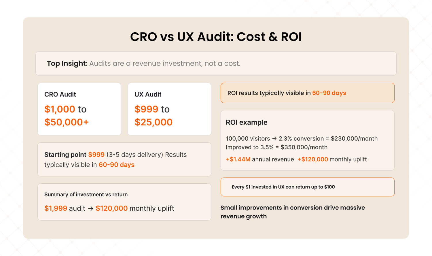 CRO audit costs range from $1,000 to $50,000+ depending on scope. UX audit costs range from $999 to $25,000. Our audits start at $999 with delivery in 3 to 5 days. ROI typically shows within 60 to 90 days. For a $10M eCommerce company, even a 1% conversion improvement means $100,000+ in annual revenue.