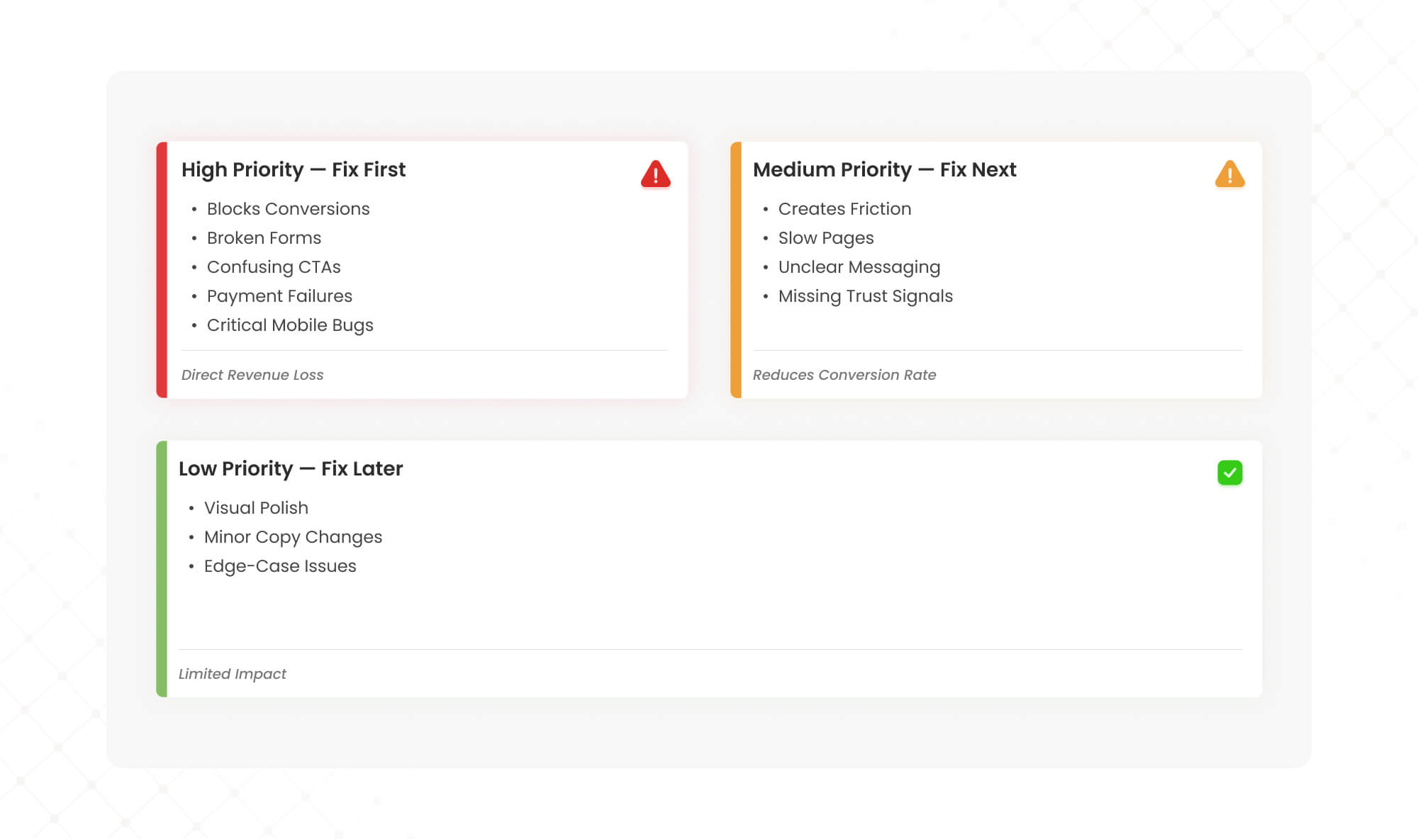 High Priority (Fix First) Issues that directly block conversions: broken forms, confusing CTAs, failed payment flows, critical mobile bugs. These are costing you money every day.