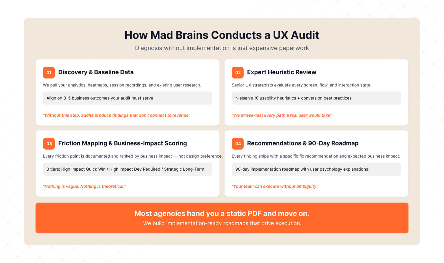 At Mad Brains, every audit is scoped after a brief discovery call — because a focused checkout audit for an e-commerce brand has different requirements than a full-platform SaaS review.