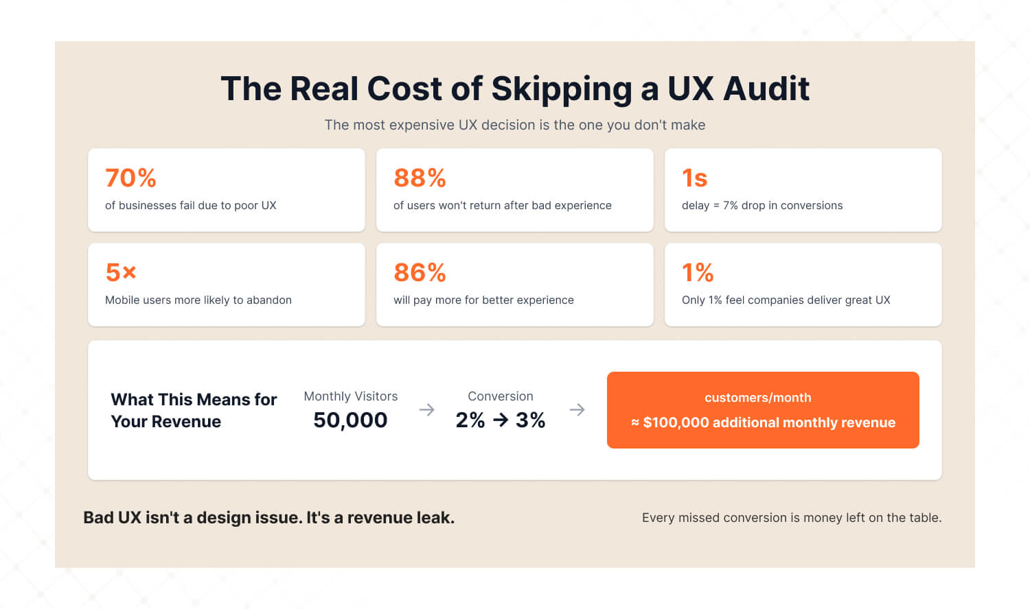 The math is straightforward: if your product gets 50,000 monthly visitors and converts at 2%, fixing a UX issue that improves conversion to 3% adds 500 new customers per month. At an average customer value of $200, that's $100,000 in additional monthly revenue — from one audit.