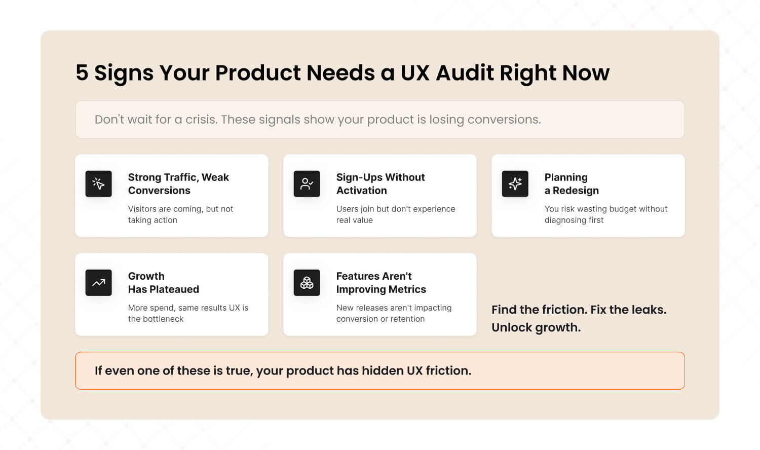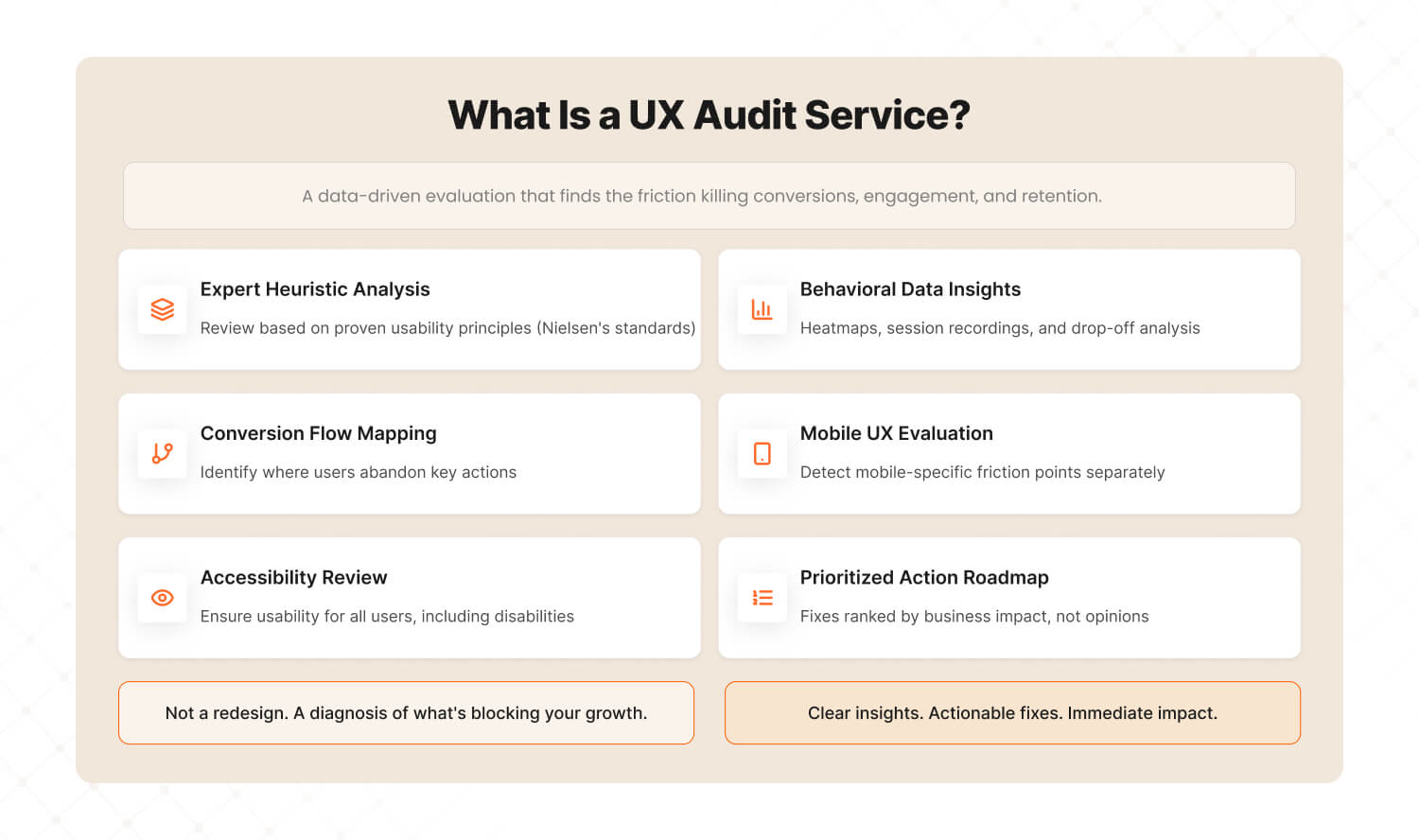 That's what a professional UX audit service does. It doesn't guess. It finds the exact leak. It tells you where to patch — and why.
