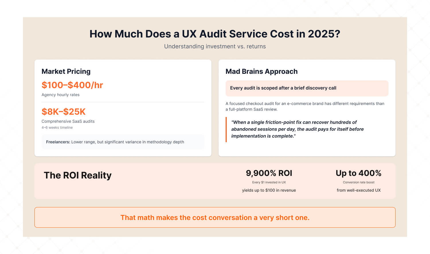 Agency-led UX audits range from $100–$400 per hour, with comprehensive SaaS audits typically running $8,000–$25,000 and taking 4–6 weeks. Freelancers typically range lower, but with significant variance in methodology depth.